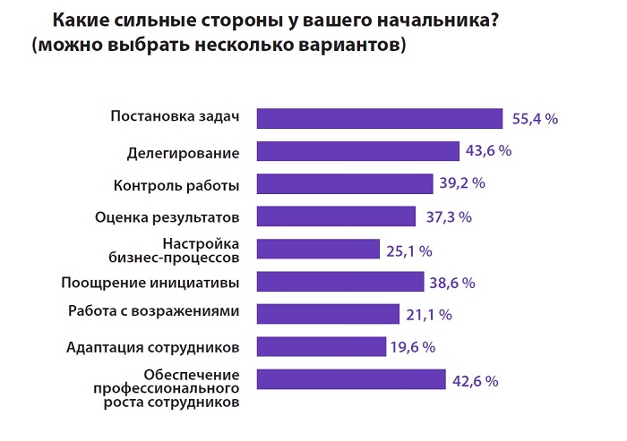 Среди ключевых сильных сторон своих руководителей участники опроса выделили постановку задач (55,4%), делегирование (43,6%) и обеспечение профессионального роста сотрудников (42,6%). И действительно респонденты отмечают, что им всегда (34,4%) или часто (53%) понятны задачи, которые перед ними ставит руководитель.