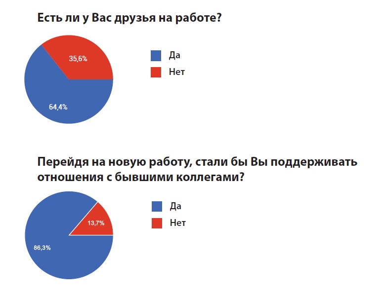 Если говорить о дружеских отношениях, то подавляющее большинство респондентов отметили, что их устраивает сложившаяся в коллективе атмосфера (91,8%). При этом на работе у многих завязывается крепкая дружба: у 86,5% опрошенных есть друзья, с которыми они познакомились на предыдущей работе, 64,4% дружат со своими сегодняшними коллегами и 86,3% респондентов хотели бы поддерживать отношения с коллегами, даже перейдя на новую работу.