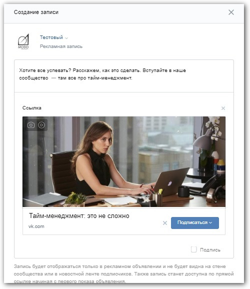 Пример создания рекламного объявления в формате «Запись с кнопкой»