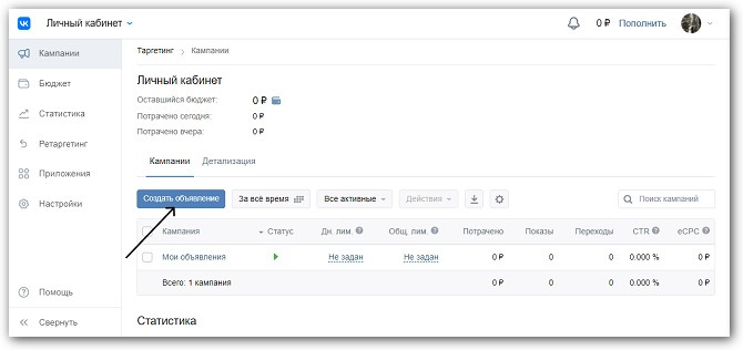 Нажмите «Реклама» в левом боковом меню. Вы попадете в рекламный кабинет, который создается автоматически.
